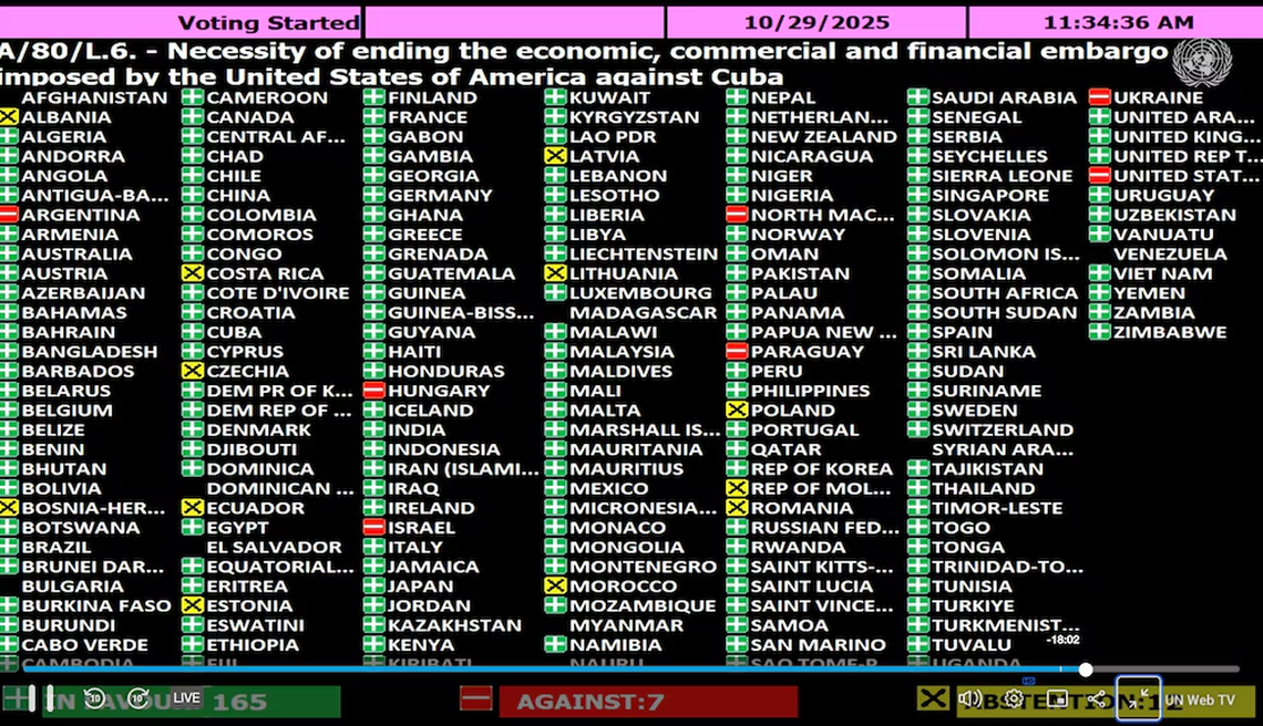 La Asamblea General de la ONU votó abrumadoramente este miércoles para condenar el histórico embargo económico de los Estados Unidos a Cuba por 33º año.