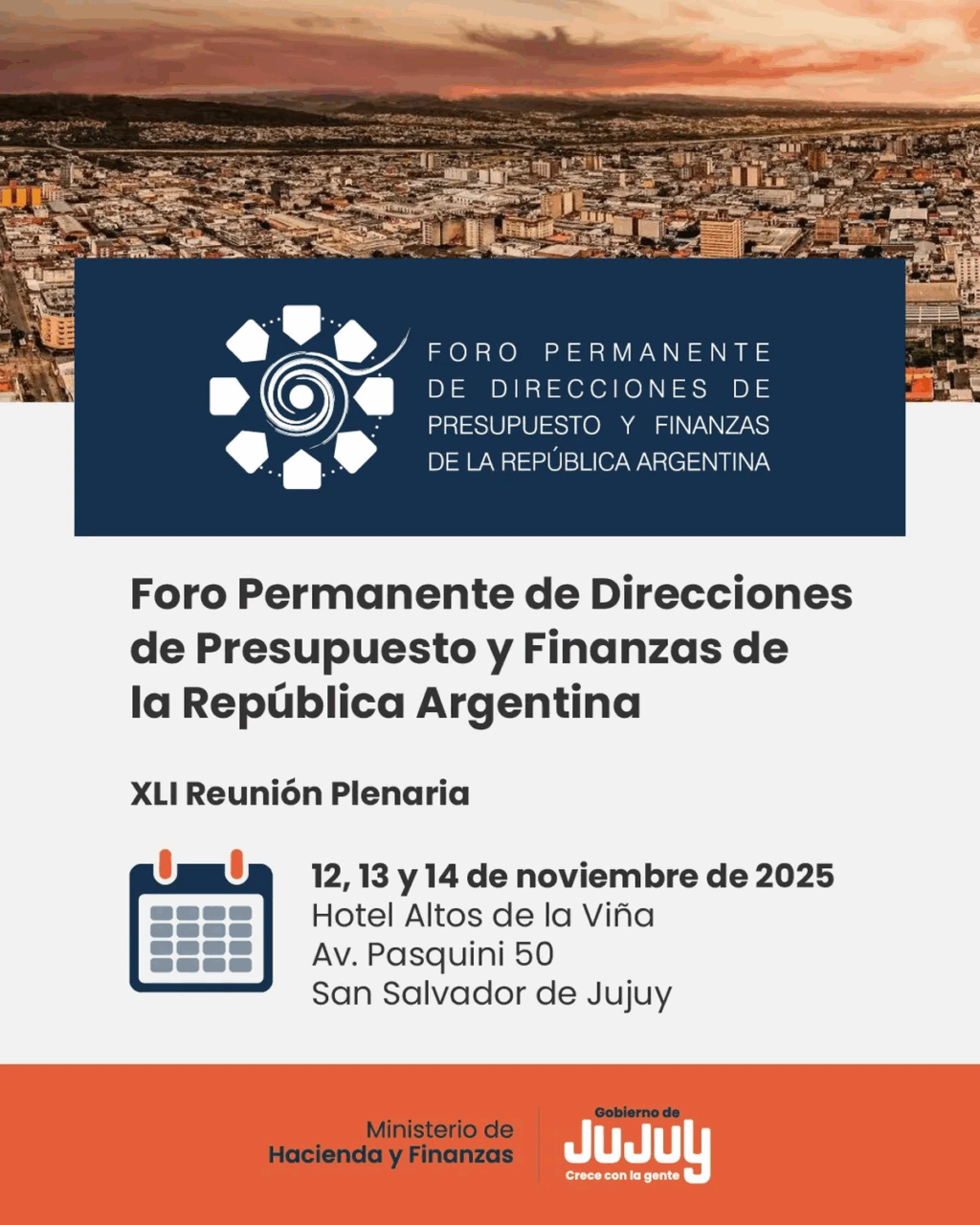 La Provincia de Jujuy será anfitriona de la 41ª Reunión Plenaria del Foro Permanente de Direcciones de Presupuesto y Finanzas de la República Argentina, que se desarrollará entre los días 12 y 14 de noviembre en las instalaciones del Hotel Altos de La Viña, en la ciudad capital.