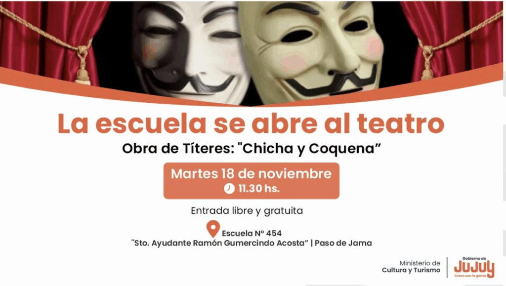 Esta actividad se enmarca en el programa «La escuela se abre al teatro», impulsado por el Ministerio de Cultura y Turismo. Busca que el arte sea un puente y que los chicos vean su cultura reflejada en el escenario y que la escuela sea el lugar donde la comunidad se reúna para celebrarla.