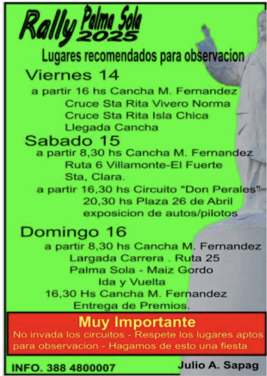 Del 14 al 16 de noviembre, Palma Sola será epicentro del automovilismo provincial con la realización del Rally Palma Sola 2025. El evento incluirá prólogo, carrera por rutas de la zona y cierre de fiestas patronales con entrega de premios.