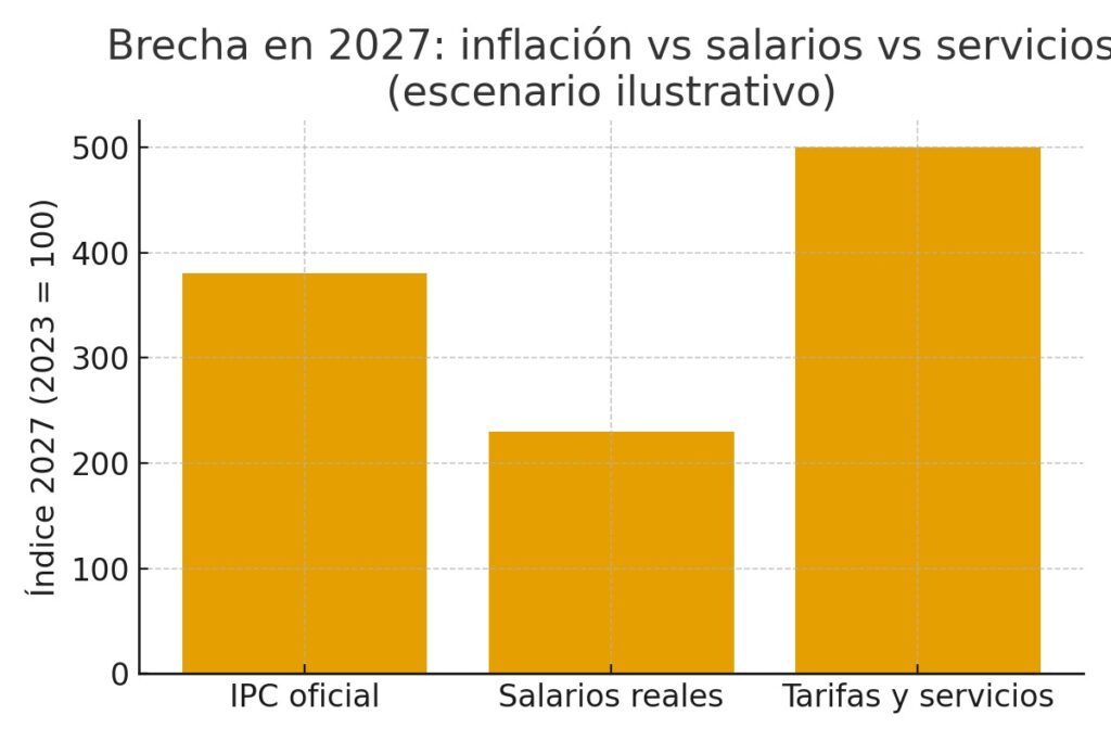 En números concretos, la brecha entre la estabilidad de los precios y la vida real es brutal: los salarios reales cayeron entre el 25% y el 33% desde diciembre de 2023, según sector y convenio. El consumo se desplomó más del 20%, con récords negativos del 30% en supermercados y electrodomésticos. La devaluación inicial del 118% multiplicó los precios de bienes importados, alimentos y combustibles en un solo movimiento. Después, con el dólar oficial pisado al 2% mensual, los aumentos siguieron llegando por otro lado: la nafta aumentó más del 150%, la luz entre 200% y 400%, el transporte más de 250%, internet y cable por encima del 100%. El salario, en cambio, venía ajustando al 2% o 3%, siguiendo el índice de inflación que publica el INDEC. La ecuación es matemática: si tu sueldo sube 3% pero tus gastos suben 15% por mes, siempre vas a perder poder adquisitivo, por más que el Gobierno festeje la “desinflación”.