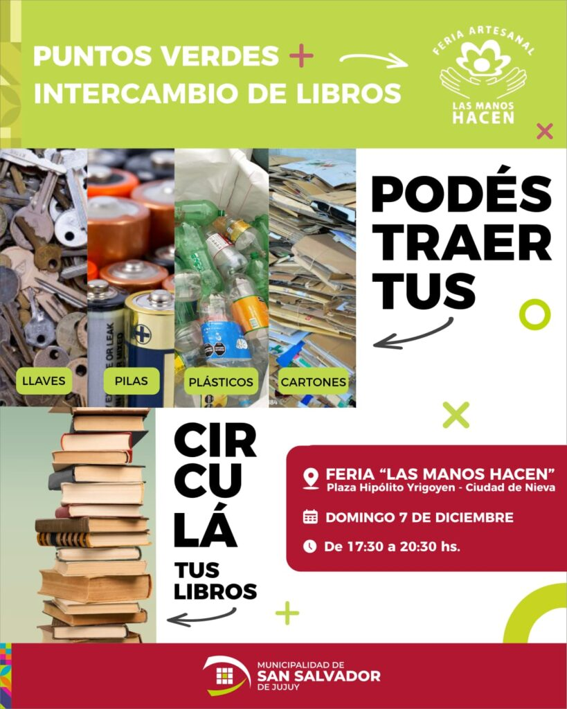 Este domingo, en la tradicional feria “Las Manos Hacen” del barrio Ciudad de Nieva, la Municipalidad de San Salvador de Jujuy incorporará una innovadora propuesta que combina el cuidado del ambiente con la promoción de la lectura. Se trata de una jornada especial de Puntos Verdes e Intercambio de Libros, una iniciativa que invita a vecinos y vecinas a acercar materiales reciclables y, al mismo tiempo, circular sus libros para darles una nueva oportunidad.