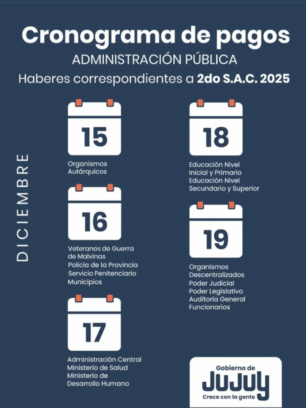 - Martes 16: Veteranos de Guerra de Malvinas, Policía de la provincia, Servicio Penitenciario, Municipios