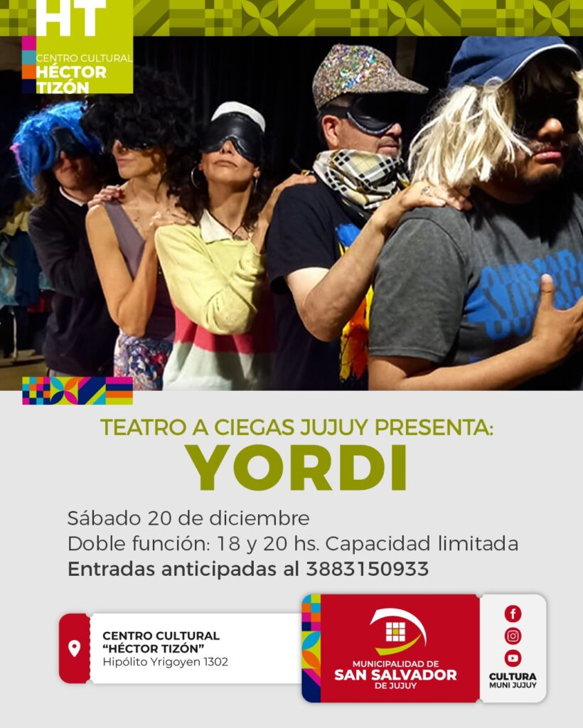 La Municipalidad de la San Salvador de Jujuy , invita a vivir una innovadora experiencia con la propuesta del Teatro a Ciegas Jujuy: “Yordi”, este sábado 20 de diciembre en el Centro Cultural “Héctor Tizón” con doble función, 18 y 20 horas. Se trata de una obra a cargo del Grupo de Teatro a Ciegas Humahuaqueño que invitó al público a redescubrir los sentidos, conectar desde otro lugar y ponerse en la piel de quienes viven el mundo sin ver. Las reservas se realizan a través del Instagram @teatrociegasjujuy”.