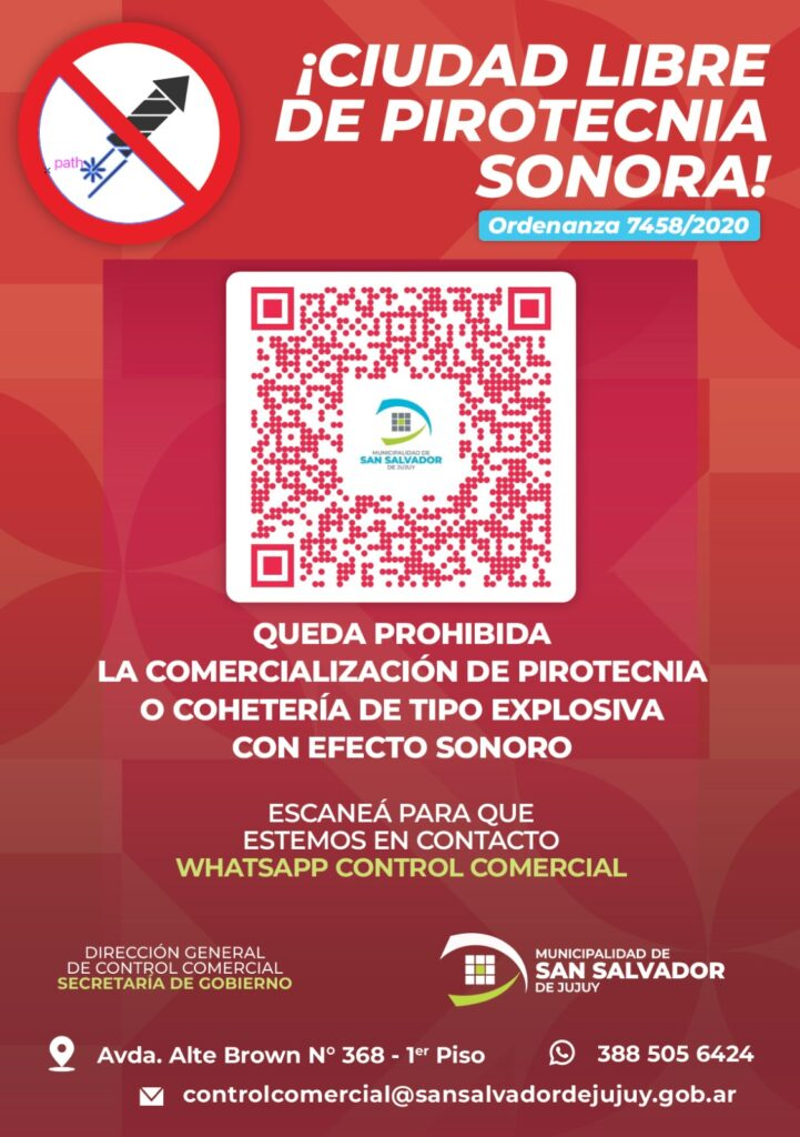 Asimismo, la Dirección General de Control Comercial, dependiente de la Secretaría de Gobierno, informa que se realizan controles permanentes para garantizar el cumplimiento de la ordenanza. Ante cualquier consulta o denuncia vinculada a la venta de pirotecnia sonora, los vecinos pueden comunicarse a través del WhatsApp de Control Comercial, disponible mediante el código QR oficial o al número 388 505 6424
