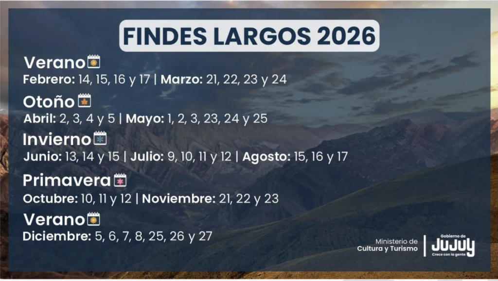 La Provincia de Jujuy invita a turistas de todo el país y al turismo interno a comenzar a planificar sus escapadas y viajes para el año 2026, aprovechando el calendario de fines de semana largos que ofrece múltiples oportunidades para descubrir la diversidad, la cultura y los paisajes únicos del destino.