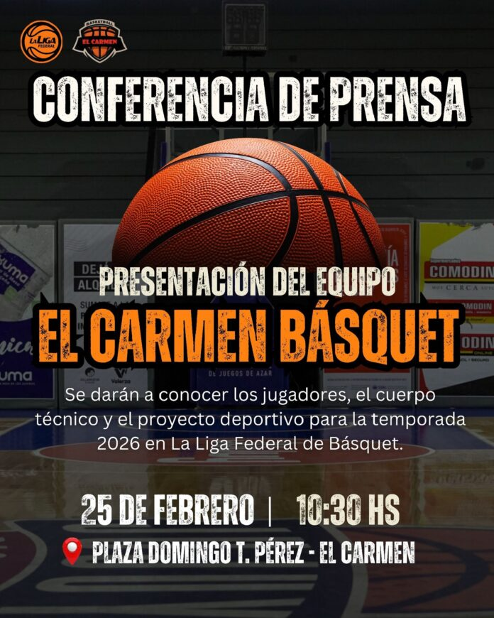 Miércoles 25 de Febrero a partir de las 10:30 hs en la Plaza Central “Domingo T. Pérez”, se realizará una conferencia de prensa para la presentación del equipo de El Carmen Básquet.