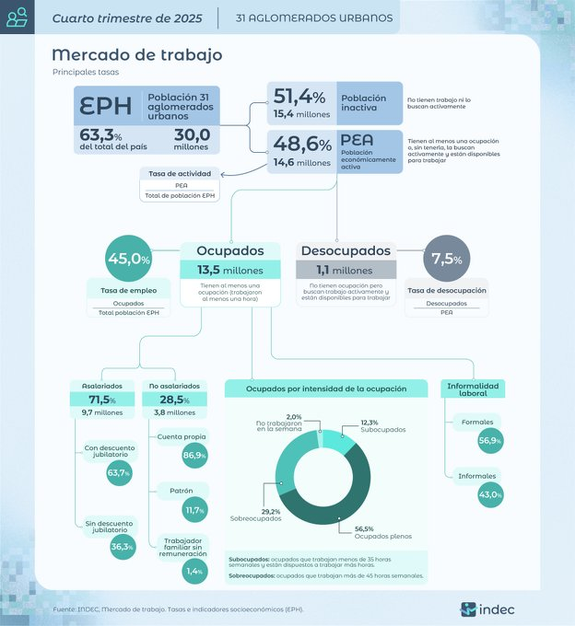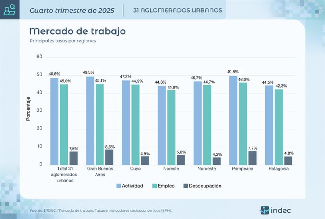 En el cuarto trimestre de 2025, las tasas de actividad y empleo en 31 aglomerados urbanos se ubicaron en 48,6% y 45%, respectivamente, al tiempo que la de desocupación, que se calcula sobre la población económicamente activa, fue de 7,5%, informó este miércoles el Instituto Nacional de Estadísticas y Censos (Indec).
