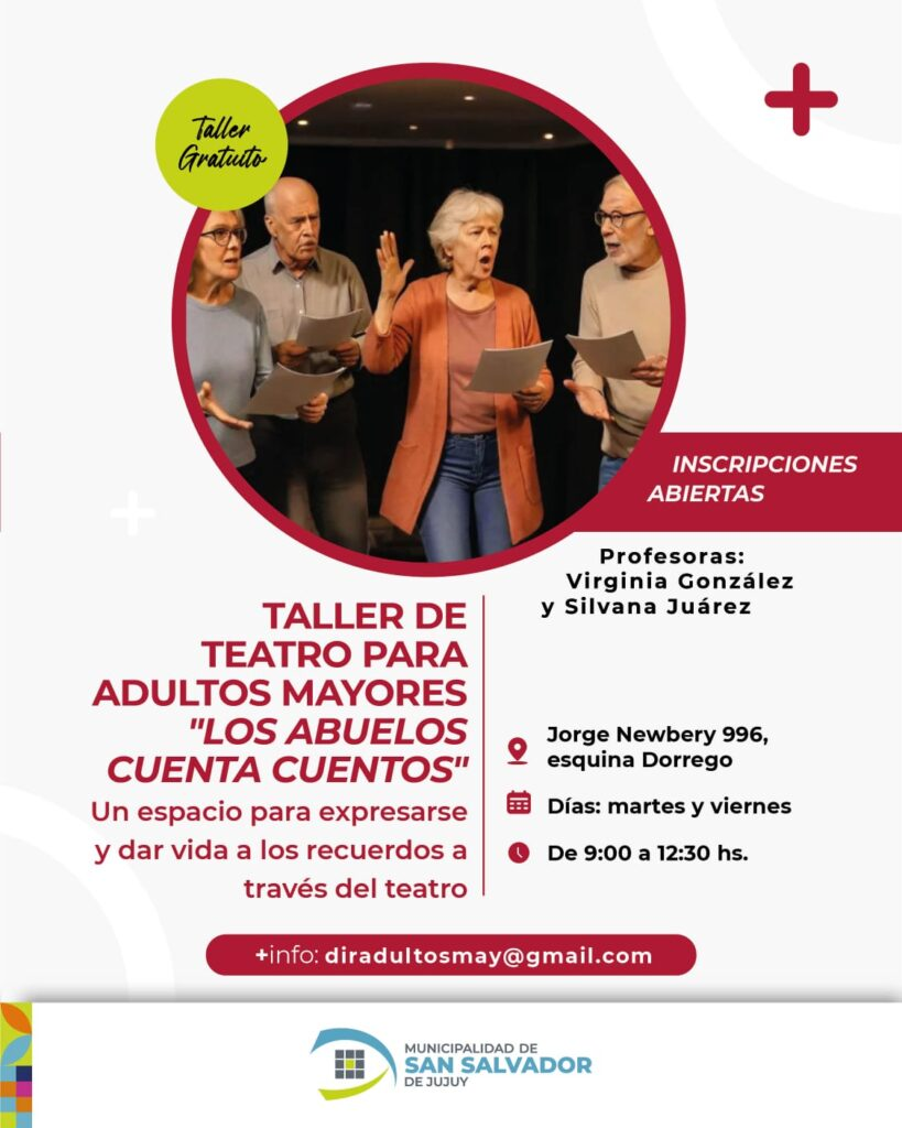 Entre las propuestas se destaca el taller de teatro “Los Abuelos Cuenta Cuentos”, un espacio pensado para que los participantes puedan expresarse, revivir recuerdos y darles vida a través de la interpretación. Las clases están a cargo de las profesoras Virginia González y Silvana Juárez, y se dictan los martes y viernes, de 9 a 12:30 horas, en el espacio ubicado en Jorge Newbery 996, esquina Dorrego. Las inscripciones se encuentran abiertas.