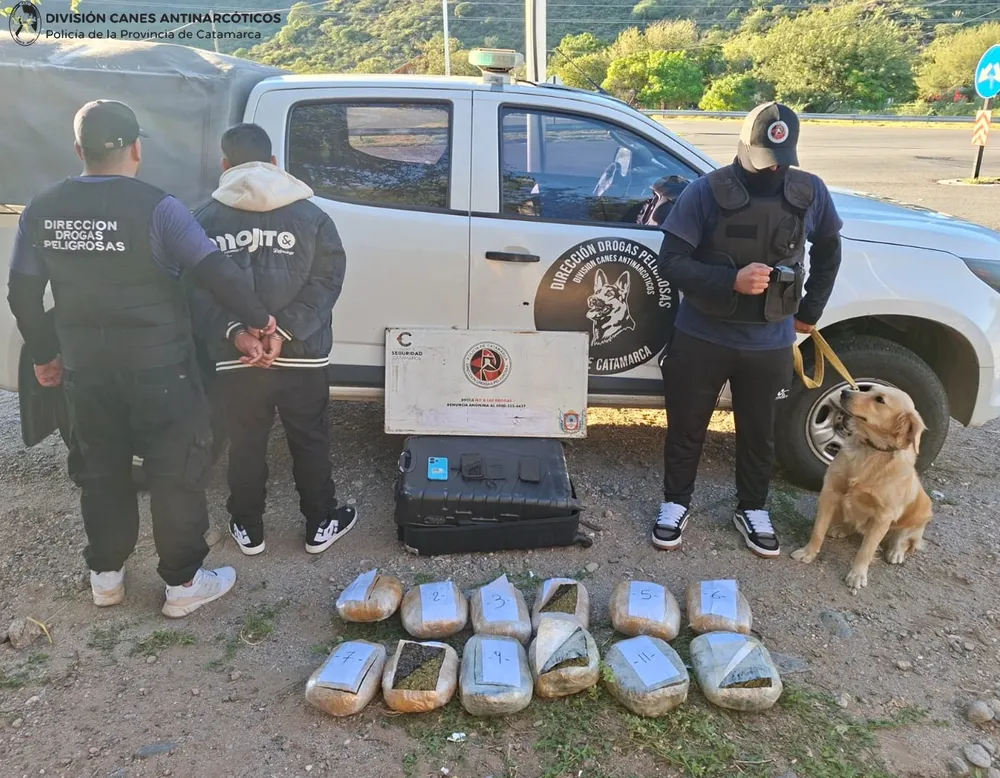 El procedimiento fue llevado adelante por efectivos de la División Canes Antinarcóticos, dependiente de la Dirección Drogas Peligrosas de la Policía de Catamarca, en un puesto ubicado a la altura del empalme con la ruta provincial N° 2, en el departamento Valle Viejo.