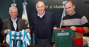 El gobernador Gerardo Morales, en el marco del histórico primer partido de la Copa Argentina en Jujuy, y en compañía...