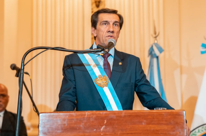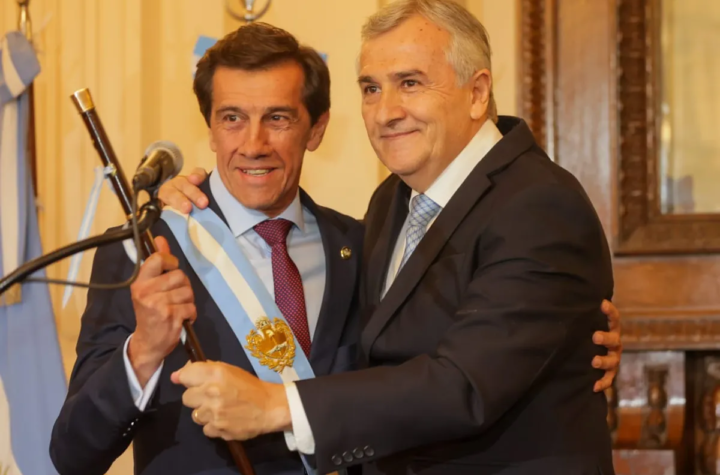 El gobernador de la Provincia, Carlos Alberto Sadir, recibió del mandatario saliente, Gerardo Morales, la banda y el bastón de...