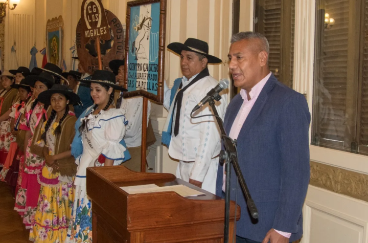 El Ministro de Trabajo y Empleo, Gaspar Alberto Santillán, junto al Presidente de la Federación Gaucha Jujeña, Bartolomé Mamani y...