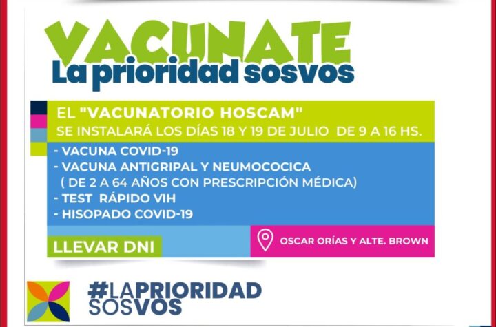 El vacunatorio HOSCAM se instalará en la repartición municipal ubicada en Almirante Brown esquina Oscar Orías, los días 18 y 19 de...