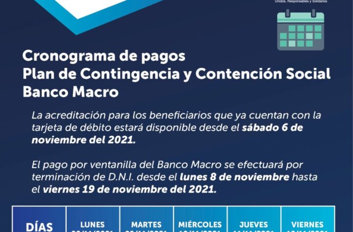 El pago a planes de contingencia inicia el lunes 23 de mayo por ventanilla del Banco Macro, mientras quienes cuenten...