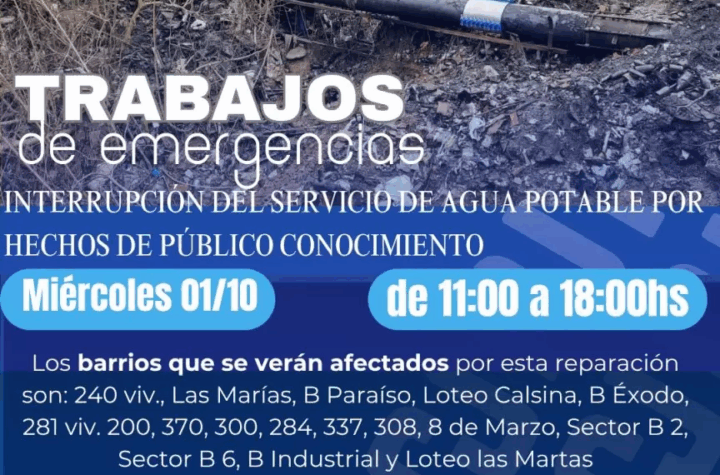 Agua Potable de Jujuy S.E. informó que este miércoles 1 de octubre se interrumpirá el servicio de agua potable en...